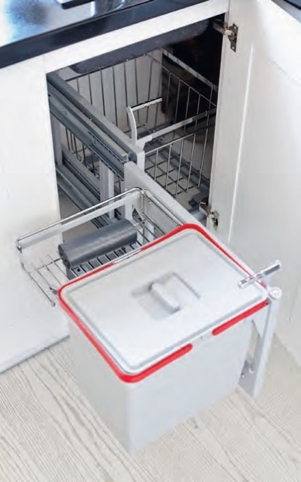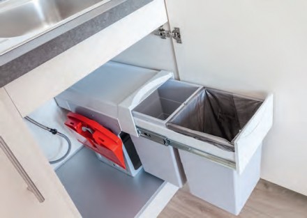 Dzisiaj oprócz typowego kosza na tzw. odpady zmieszane, jeśli miejsce na to pozwala, pod zlewem najlepiej zaplanować kilka pojemników służących do segregacji śmieci. Coraz częściej to rozwiązania systemowe. Są one wygodne w użyciu, a przy tym służą oszczędzaniu przestrzeni, która dzięki nim jest pod zlewem wykorzystana optymalnie, szczególnie jeśli zostanie zaprojektowana. Zanim wybierzemy system, wymierzmy szerokość szafki – zestawy są najczęściej dostosowane do szafek o szerokości 60 cm, chociaż są też sortowniki przeznaczone do węższych szafek projektowanych pod zlewozmywaki jednokomorowe. Ciekawą propozycją są kosze przeznaczone do stref narożnych.