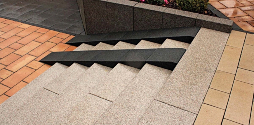- niestaranny montaż – uszkodzenia mechaniczne, głównie naroży stopni, a także pęknięcie lub złamanie płyty biegu.