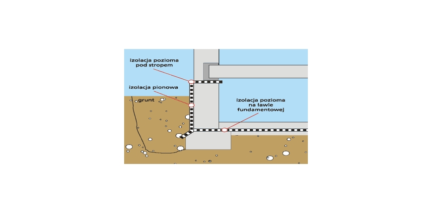 • izolacje poziome - zabezpieczają ściany przed kapilarnym podciąganiem wilgoci, układane są przeważnie na ławach fundamentowych i w ścianach piwnic nad stropem,