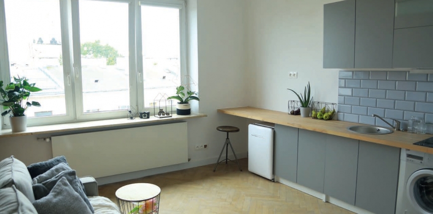 Pierwotnym zamysłem było, by lokal służył przede wszystkim celom mieszkalnym. Położenie w pobliżu kilku uczelni gwarantowało zainteresowanie najmem przede wszystkim u młodych ludzi, ale styl mieszkania i jego wyposażenie miały być jak najbardziej uniwersalne. Kluczem w takich przypadkach jest dobra baza – tutaj okazał się nią stary dębowy parkiet ułożony w jodełkę, który stał się dobrym tłem dla innych materiałów i wyposażenia. W małym mieszkaniu szczególnie trzeba zadbać, aby aranżacja była spójna – nadmiar materiałów i kolorów sprawia wtedy wrażenie chaosu oraz zacieśnia i tak małą przestrzeń. Zastosowano więc sprawdzoną zasadę ograniczenia liczby materiałów i użytych kolorów do minimum. Jasne drewno powtórzono na kuchennym blacie, w kuchni i łazience zastosowano ten sam kształt płytek ceramicznych – modną, a zarazem neutralną estetycznie cegiełkę, różnicując jedynie jej kolorystykę. Dzięki jasnym kolorom i ograniczeniu okładzin z płytek do miejsc narażonych na styczność z wodą, mieszkanie wydaje się bardziej przestronne i optycznie większe. Wyposażono je tylko w niezbędne do mieszkania sprzęty: rozkładaną kanapę, komodę na bieliznę i drobiazgi. Blat kryjący szafki w kuchennym aneksie zamontowano na całej długości ściany – w części, w której nie ma pod nim szafek może posłużyć jako barek do spożywania posiłków czy jako blat do pracy. Takie neutralne wykończenie i ograniczone do minimum wyposażenie jest jednocześnie doskonałą bazą do uzupełnienia indywidualną aranżacją przez każdego z najemców – można ją wzbogacić dodatkowymi sprzętami czy kolorami, uzyskując w ten sposób własne, spersonalizowane wnętrze.